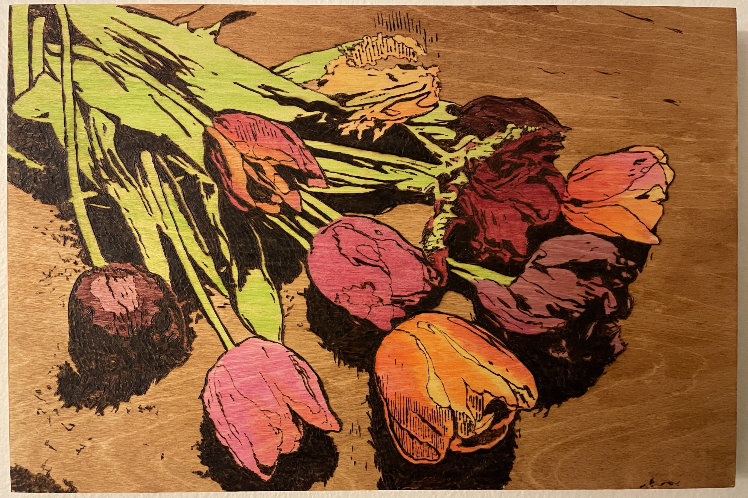 8in x 12in wood burning on birch canvas - stained with coffee and natural food coloring